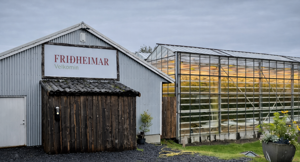 Í Friðheimum er hægt að fá tómatsúpu og nýbakað brauð ásamt öðru góðgæti í notalegu umhverfi í gróðurhúsi.